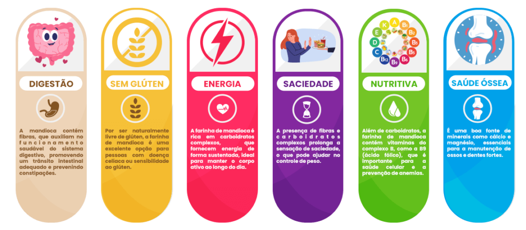 Fonte de Energia: A farinha de mandioca é rica em carboidratos complexos que liberam energia de forma gradual e sustentada, ideal para manter o corpo ativo ao longo do dia.